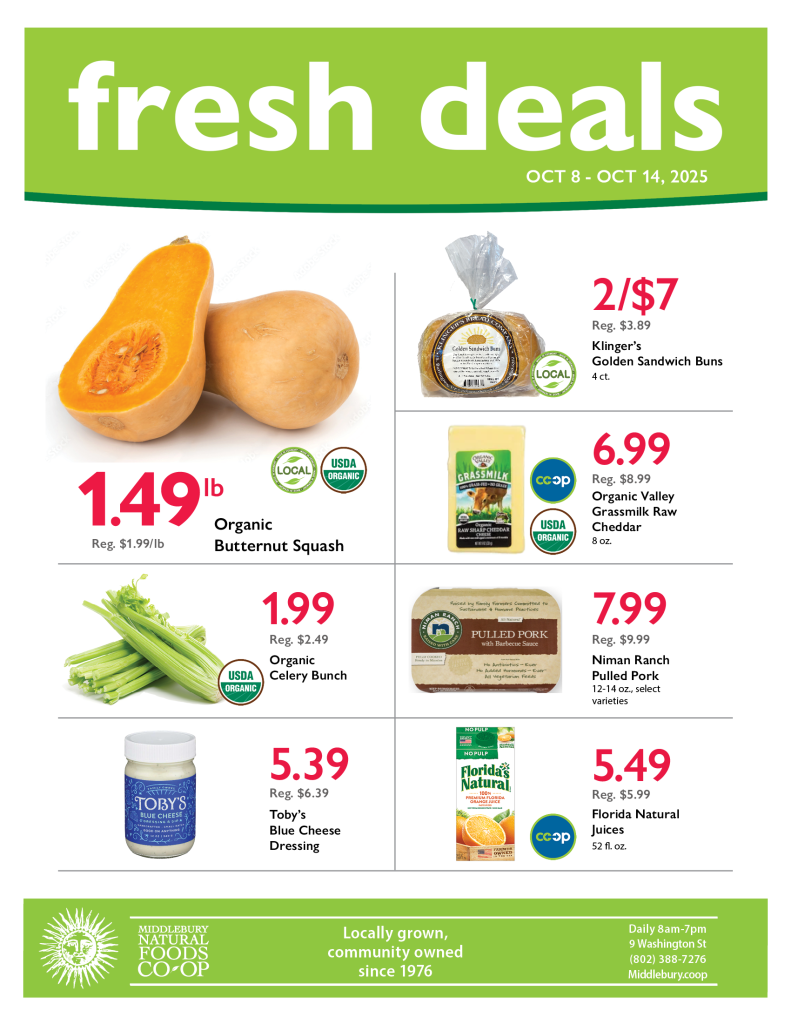 A coupon and the Member Deal appear every week on Page 2 of Thursday’s Addison Independent. Check our Fresh Flyer for fresh deals on produce, dairy, meat, and deli every week! Looking for even more savings? Check out our new Co-op Deals Flyer (now with only items we carry!)